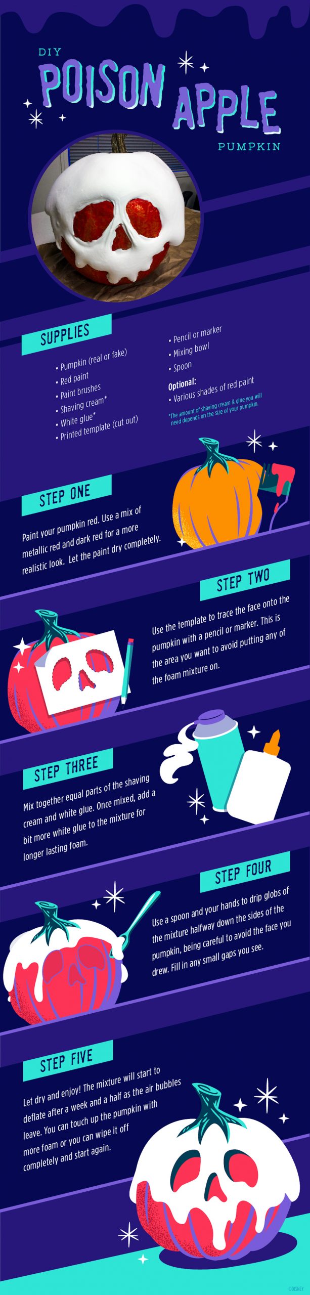 My favorite DIY from Disney Parks though is the poison apple pumpkin! This pumpkin design is inspired by the Evil Queen’s cursed apple from Snow White and the Seven Dwarfs!